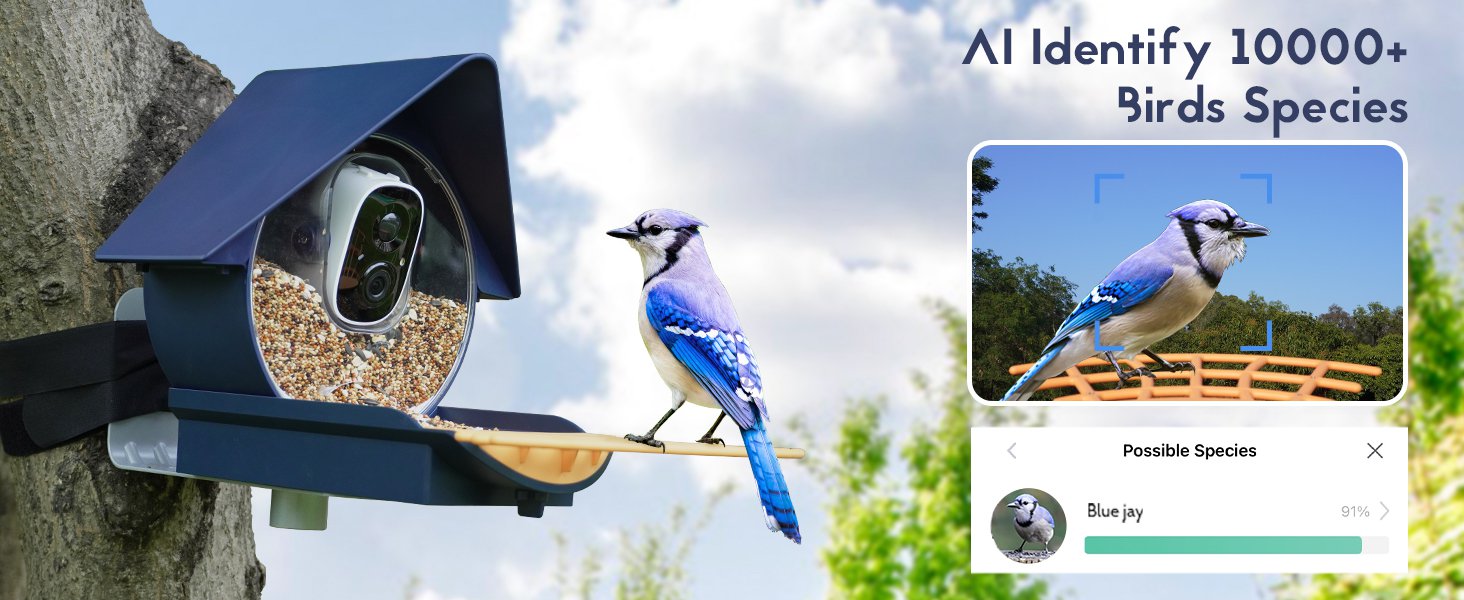 The camera bird feeder's cutting-edge AI technology identifies bird species. *AI recognition needs subscription plans starting at $2.99/month in App.