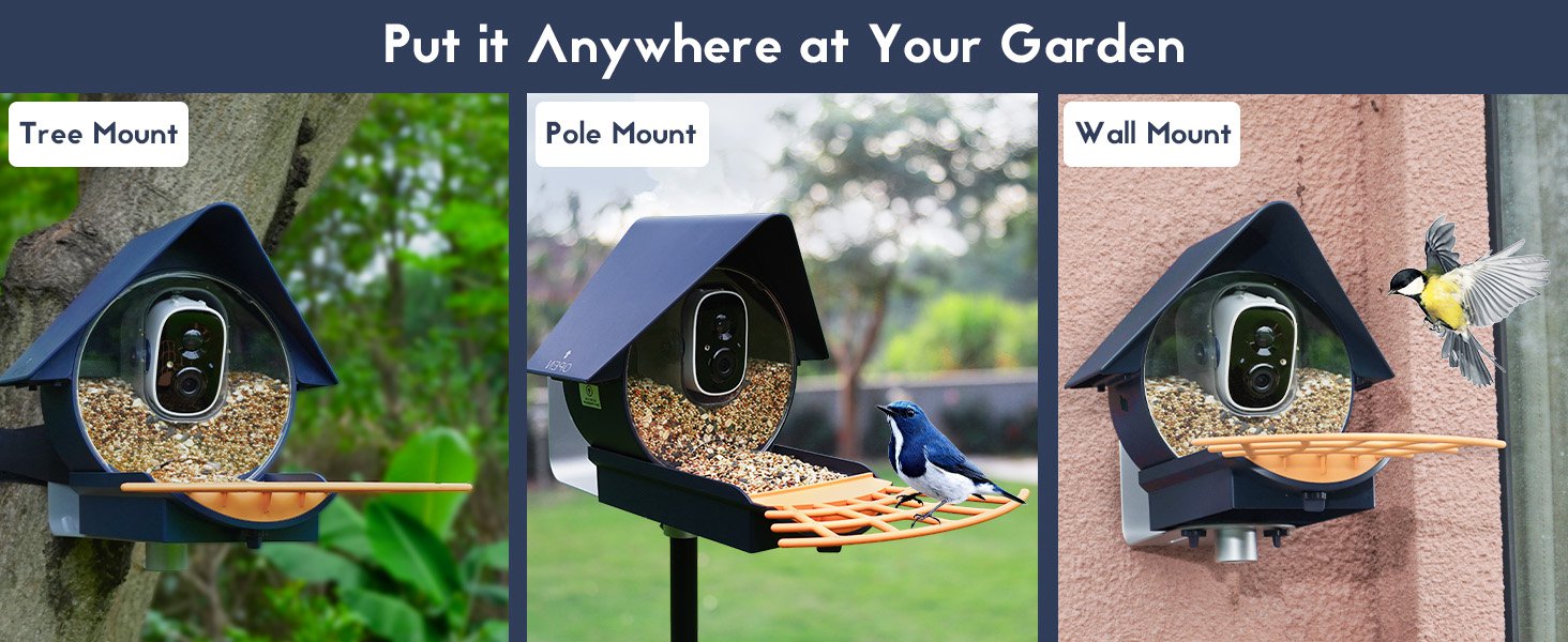 With our mounting bracket and bracket kit, Birdkiss can be firmly fixed on a wall, tree or standard-sized birdhouse pole with a 1"/ 2.55cm outer diameter. Pole not included in the package.