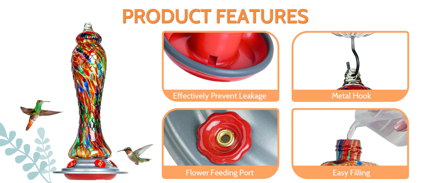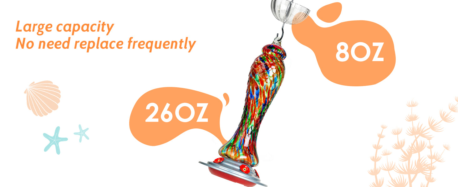 - LARGE DESIGN - Birdkiss hummingbird feeder offer of a high-quality, hand-blown glass body and 5 flower metal feeding ports. The large design holds a whopping 26 ounces of sugar water, keeping your hummingbirds happy for quite some time.