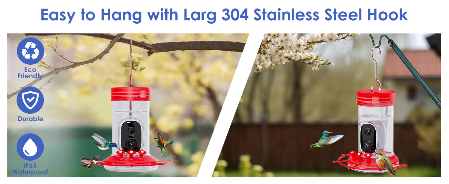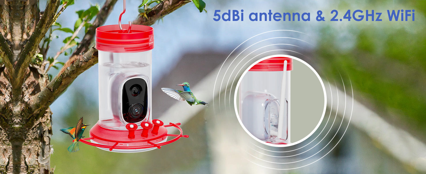 The humming birdhouse with camera features a 5000 mAh battery. A 5dB external antenna enhances the smart feeder's 2.4GHz WiFi signal reception for reliable, long-range internet access, ensuring seamless real-time monitoring. The clear video bird feeder camera can motion activated recording 1080P HD resolution video of visiting wild birds, so you never miss a moment. Watch backyard feather friends from nature anytime, anywhere.